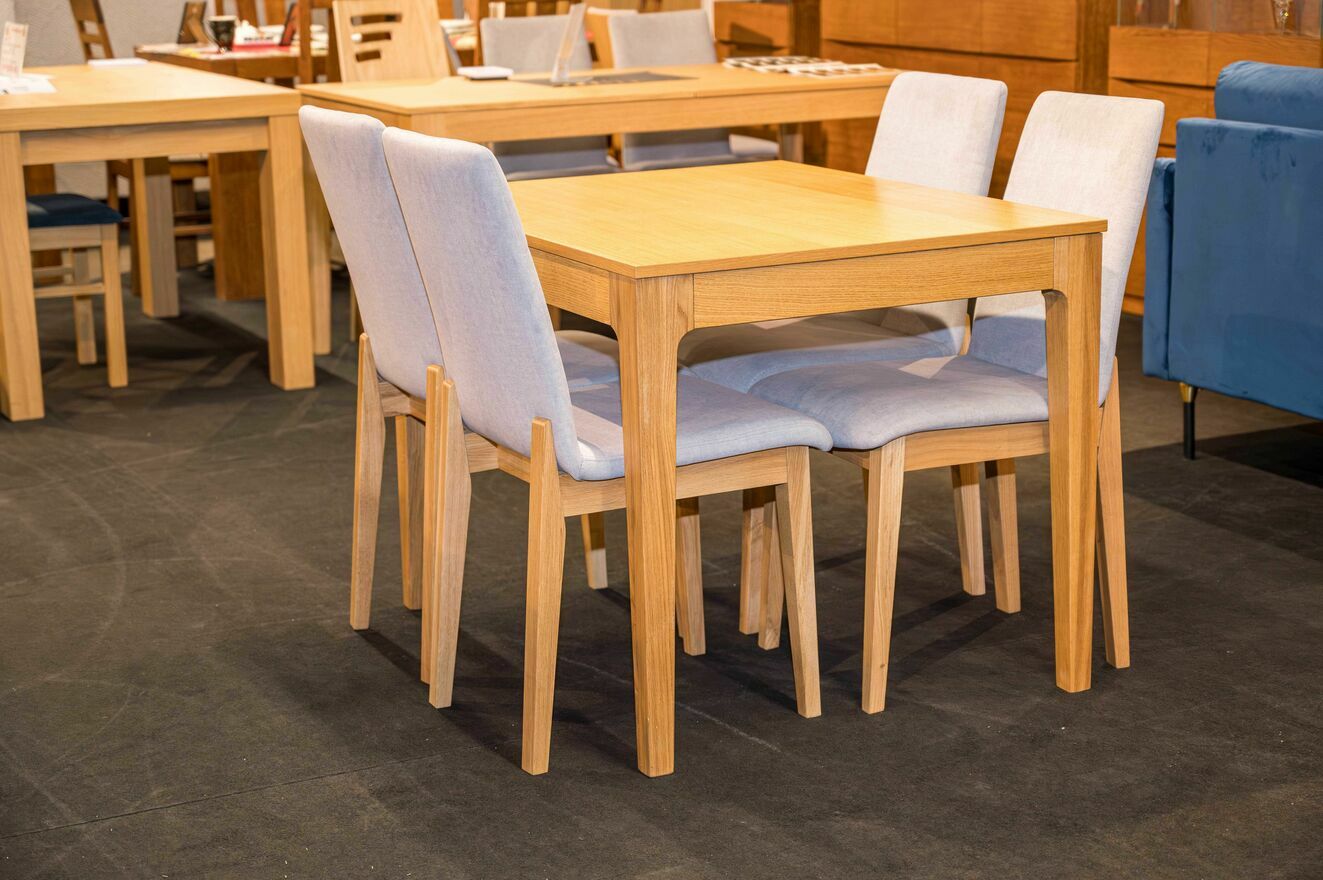 Stół wykonany z okleiny dębowej, kolekcja 2025 + 4 krzesła (takie jak na zdjęciach)Wymiary: 100x80 + 1x40