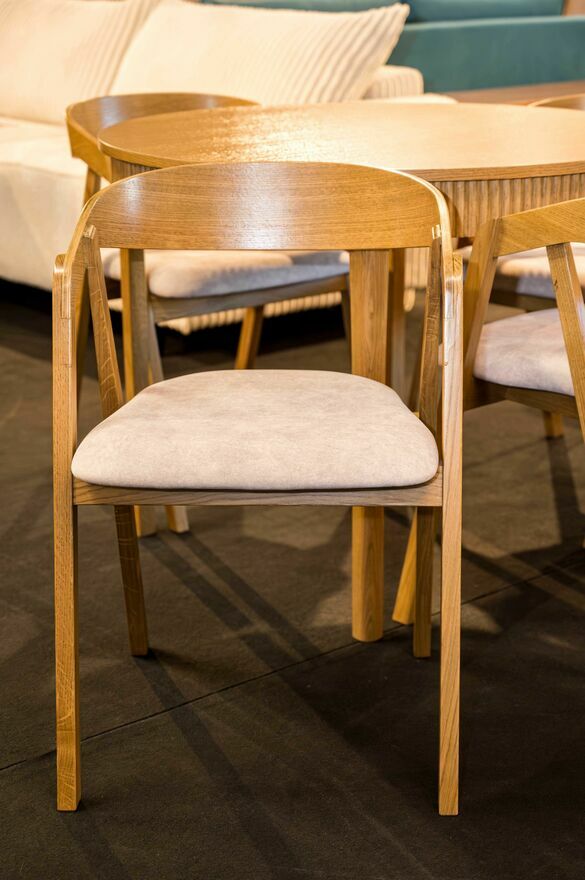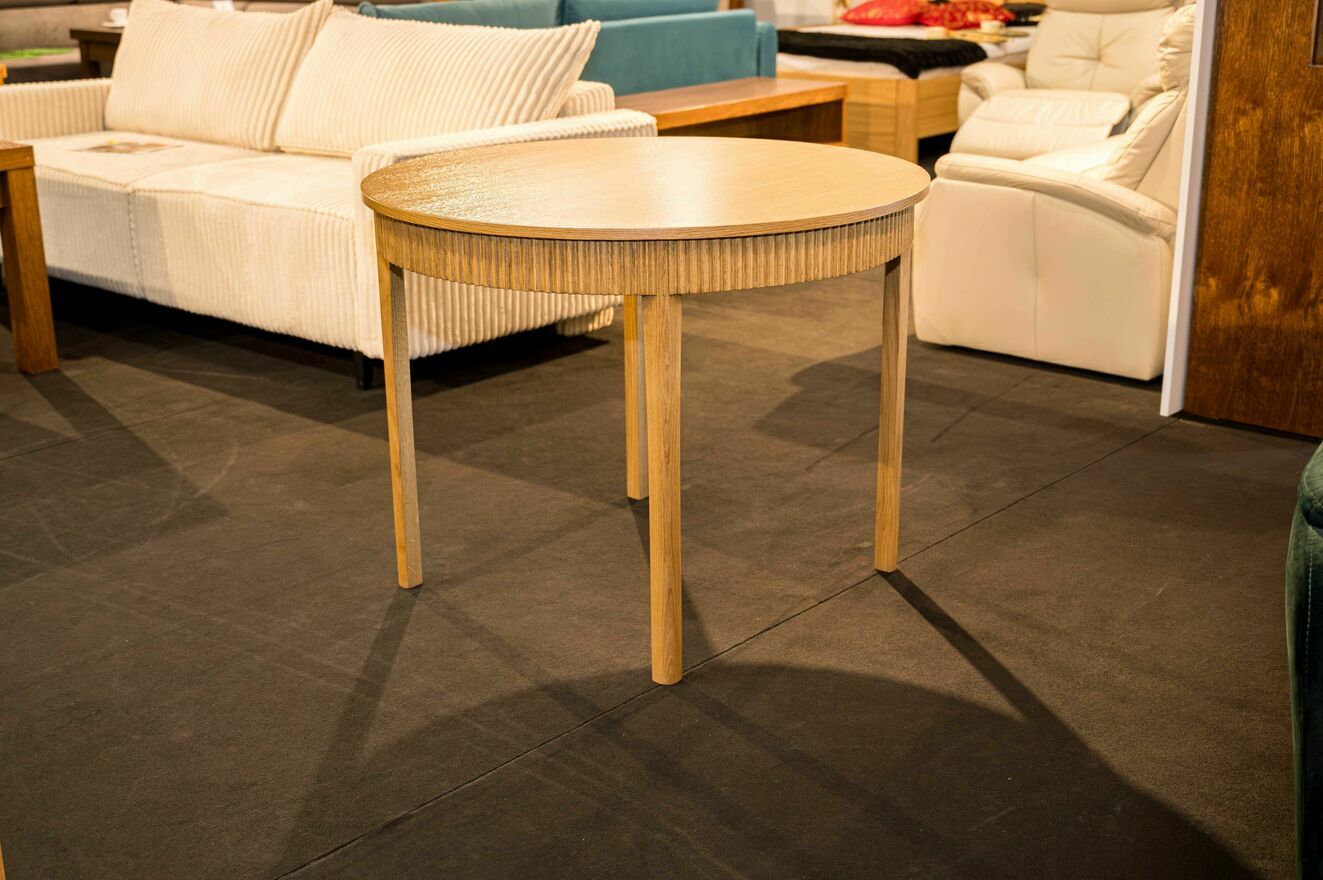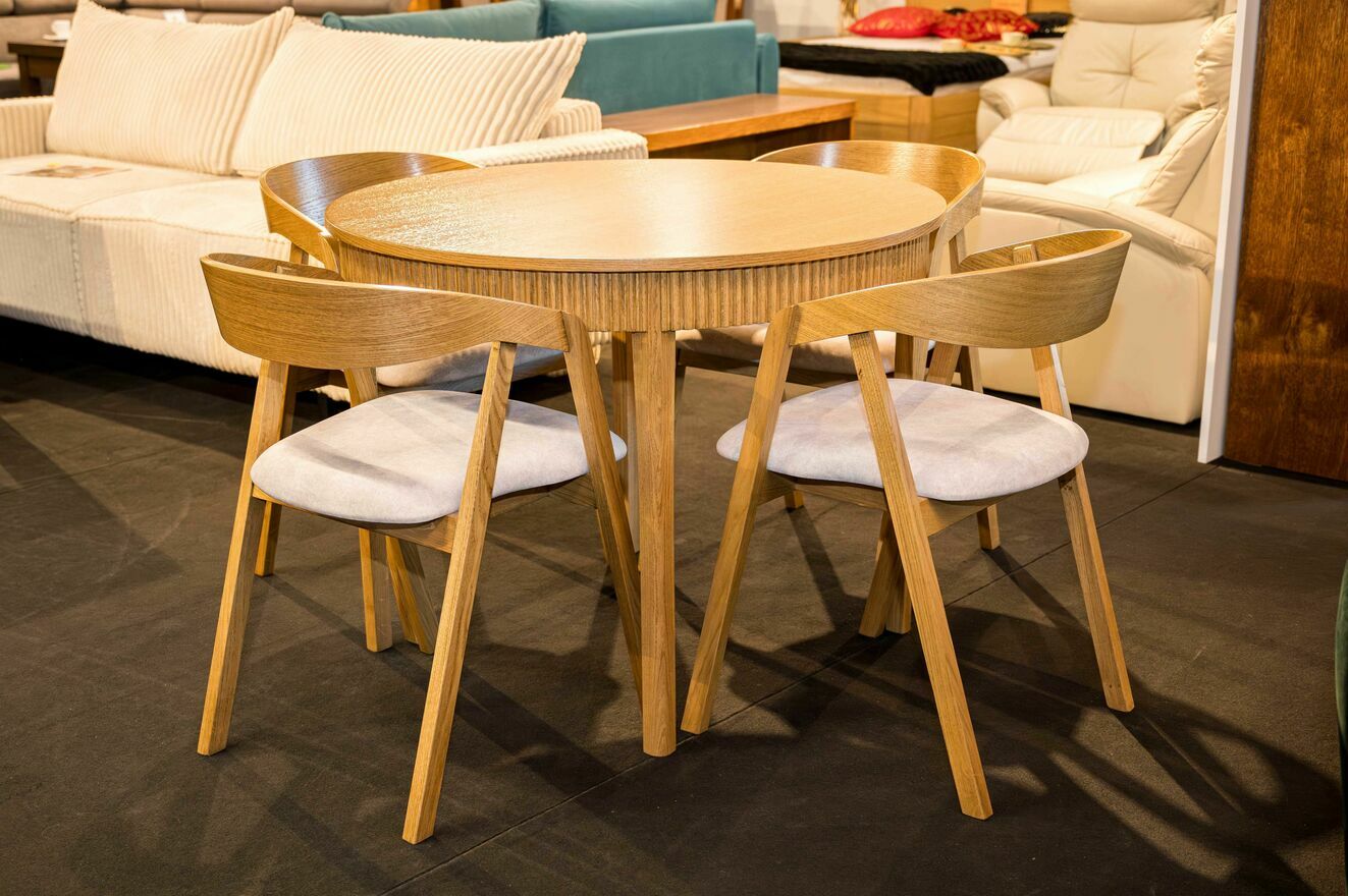 Stół okrągły z okleiny dębowej, Kolekcja 2025 + 4 krzesła (takie jak na zdjęciach)Wymiary: Ø 100cm, wysokość 77cm