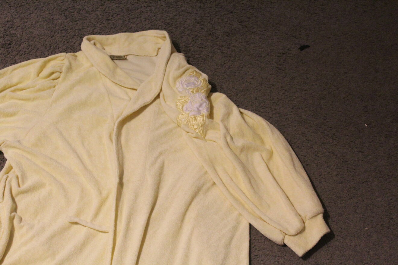 Sprzedam szlafrok żółty z haftem na rękawie - mało używany - rozmiar 46- 48- z paskiemRita